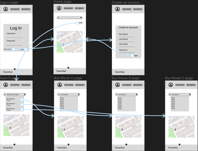 I began with a competitive analysis of Google Maps and the Transit App. Google Maps did a great job at providing the commuter with different options, such as a feature to allow the person to simulate a trip and choose the best form of transportation. This transportation could be public, bus or train, or private, personal car. They have a map as the center point of the app, this allows the user to see where they are and also allows them to look at their final destination.