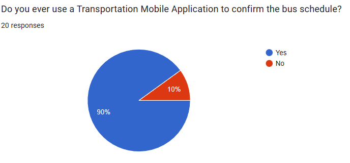 This is particularly troubling because 90% of the individuals who were surveyed used the mobile app to look up the current bus schedule. The goal of my app was to provide the user with an accurate schedule to predict when the bus would arrive, as well as which bus will be arriving.