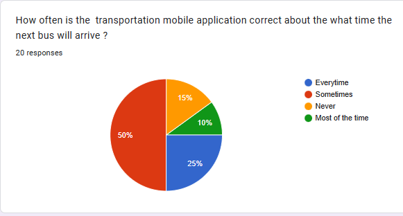 The second form of research was surveys provided to individuals who use public transportation and use the app as an informative tool. more than half of the commuters included in the survey used the bus to get to and from work.